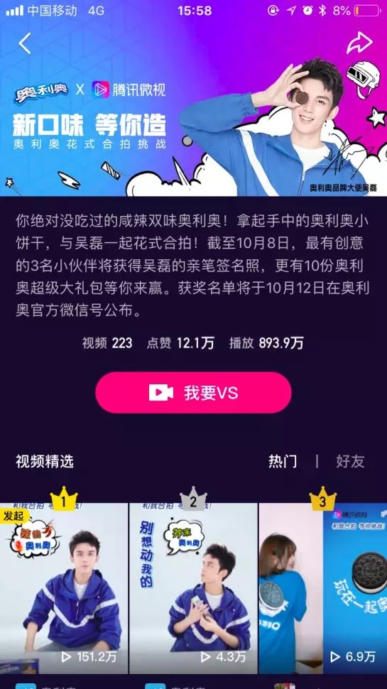 最近(jìn)大(dà)熱(rè)的(de)奧利∞ε↓奧花(huā)式合拍(pāi)挑戰「新口味 等你(nǐ)造」活動中,就&✔≥(jiù)是(shì)使用(yòng)了(le)「與TA合拍(pāi)」功能(néng),通(™ β☆tōng)過加入了(le)分(fēn)屏視(shì)頻(pín)→÷↑↑的(de)玩(wán)法——一(yī)個(gè♠ε₽)屏幕中同時(shí)出現(xiàn)多(duō)個(gè)畫(‍£✘huà)面,這(zhè)樣一(yī)來(lái),追星女(nǚ)孩♠±£就(jiù)可(kě)以通(tōng)過同框與國(guó)民(mín)初✔ &​戀吳磊弟(dì)弟(dì)分(fēn)享一(' yī)塊奧利奧餅幹,與愛(ài)豆同框進行(xíng)甜蜜互動,活動一✘¶≤₹(yī)經推出,短(duǎn)時(shí)間(jiān)內(nèi)觸發近(jìn)千萬曝光(≤ ♠guāng)。