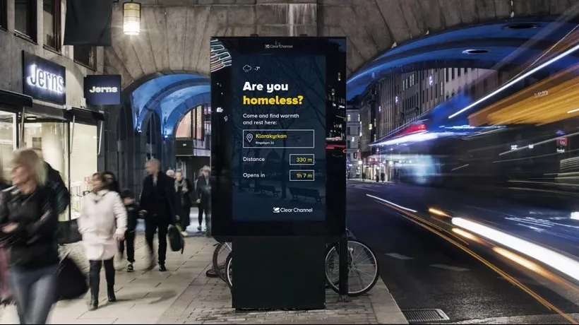 近(jìn)期,美(měi)國(guó)大(dà)衆媒體(tǐ)公司清晰÷↑γ頻(pín)道(dào)(Clear Channel)與↓$'$斯德哥(gē)爾摩市(shì)展開(kāi ÷)了(le)一(yī)項合作(zuò)——将它的(de)廣告牌用(y©∑‌£òng)于幫助無家(jiā)可(kě)歸者尋找并前往距離(lí)最ε♠ 近(jìn)的(de)庇護所。在活動中,清晰頻(pín)道(dào)公司對(duì)其•$♦在該市(shì)的(de) 53 塊廣告牌進行(xíng)了(le)編程,從(cón±≤•g)而使其可(kě)以根據城(chéng)市(shì)氣溫交替。